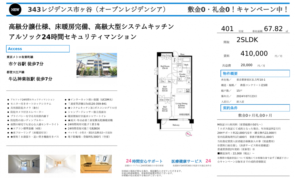 交通の面では東京メトロ有楽町線「市ヶ谷」駅から徒歩7分、都営大江戸線「牛込神楽坂」駅から徒歩7分の場所に位置しています。