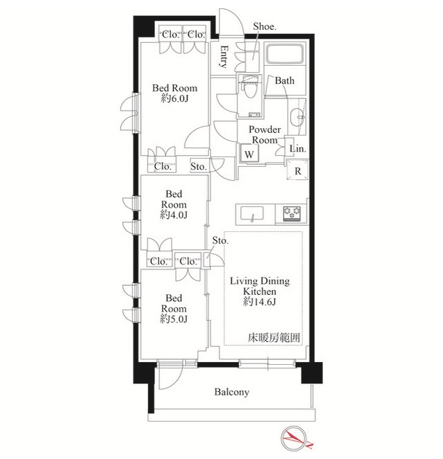 LDK部分は14.6帖、寝室は6帖・5帖・4帖の3部屋です。