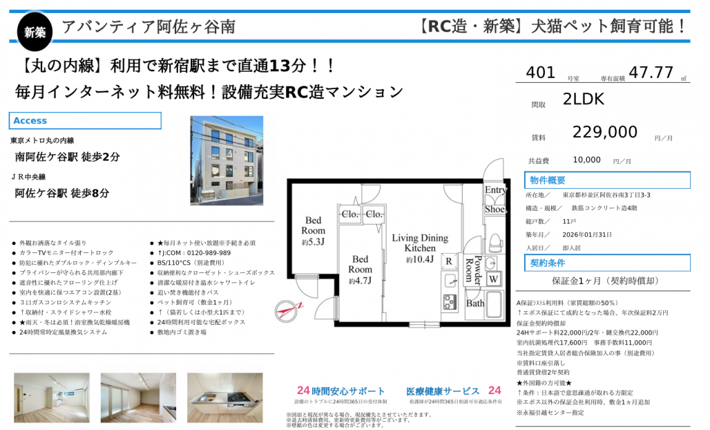 丸ノ内線沿線で、駅近・ペット可・2LDKという希少条件が揃った注目物件です。