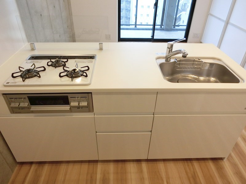 キッチンは3口ガスコンロ・グリル付きシステムキッチン。