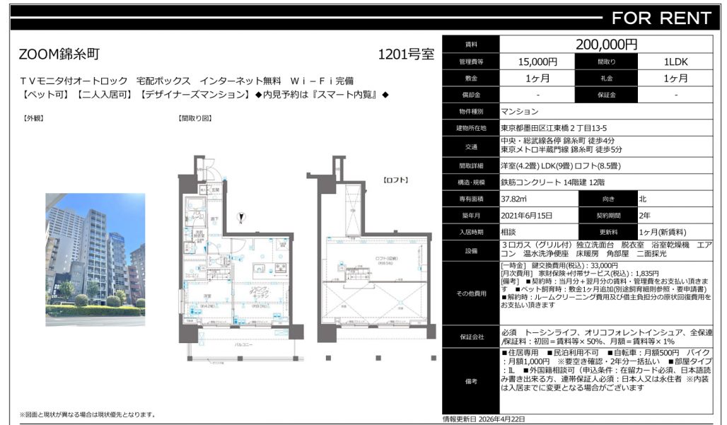 駅徒歩5分という利便性の高さはもちろん、37㎡を超える広さに加えて約8.5帖のロフト空間が設けられており、一般的な1LDKではなかなか味わえない開放感を実現しております。