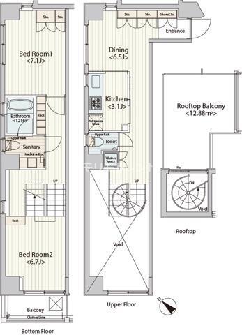 2DKタイプは、ダイニング7.1帖・キッチン3.1帖、洋室は6.7帖と7.1帖の振り分けタイプ。