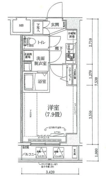 間取りは洋室約7.9帖の1Kタイプ。