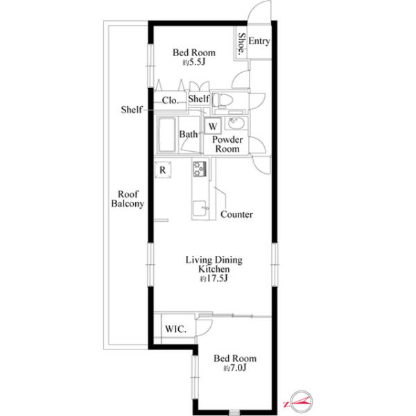 LDKを挟んで南北に振り分けられた2つの洋室7.0帖と5.5帖の振り分けタイプ。
